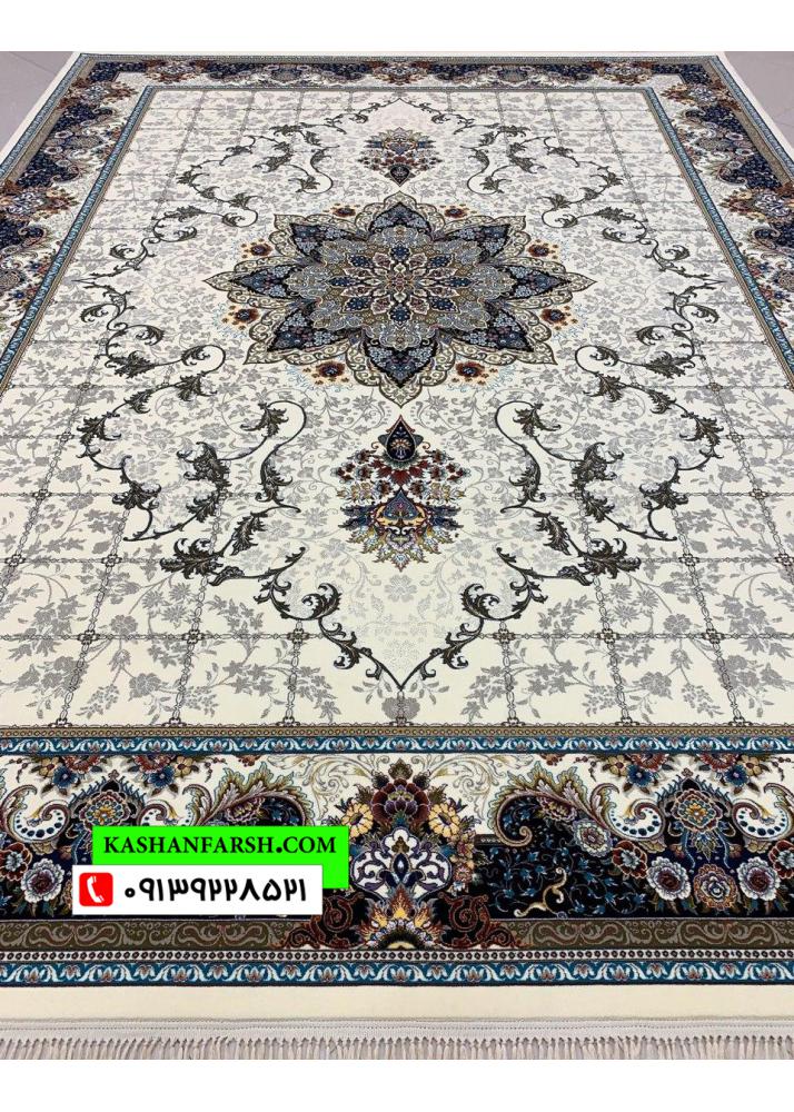 فرش درجه یک ماشینی 700 شانه ده رنگ - طرح هیوا سرمه ای و ترمه ای و کرم